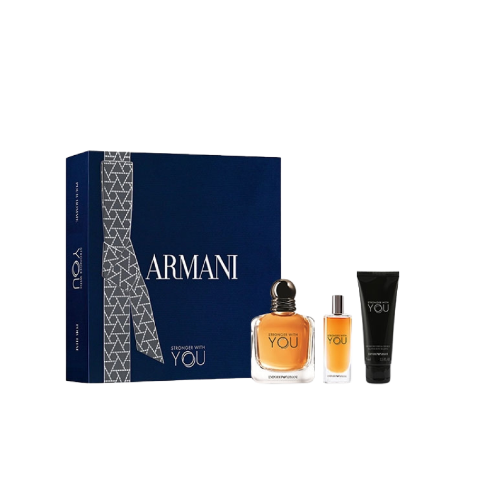 Get the Giorgio Armani Stronger With You set, a 100ml Eau de Parfum and 15ml Travel Bottle, along with a 75ml Shower Gel, for a luxurious, long-lasting fragrance experience. Shop now and add a touch of elegance to your daily routine.