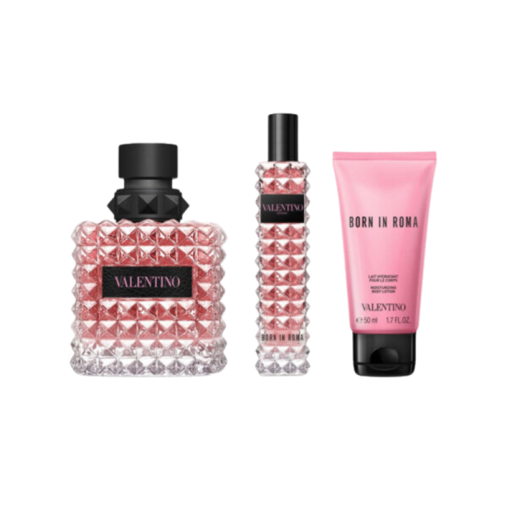 Get the Valentino Donna Born in Roma set, a 100ml Eau de Parfum and 50ml Lotion, along with a 15ml Travel Perfume Mini Bottle, for a luxurious, long-lasting fragrance experience. Shop now and add a touch of luxury to your daily routine.