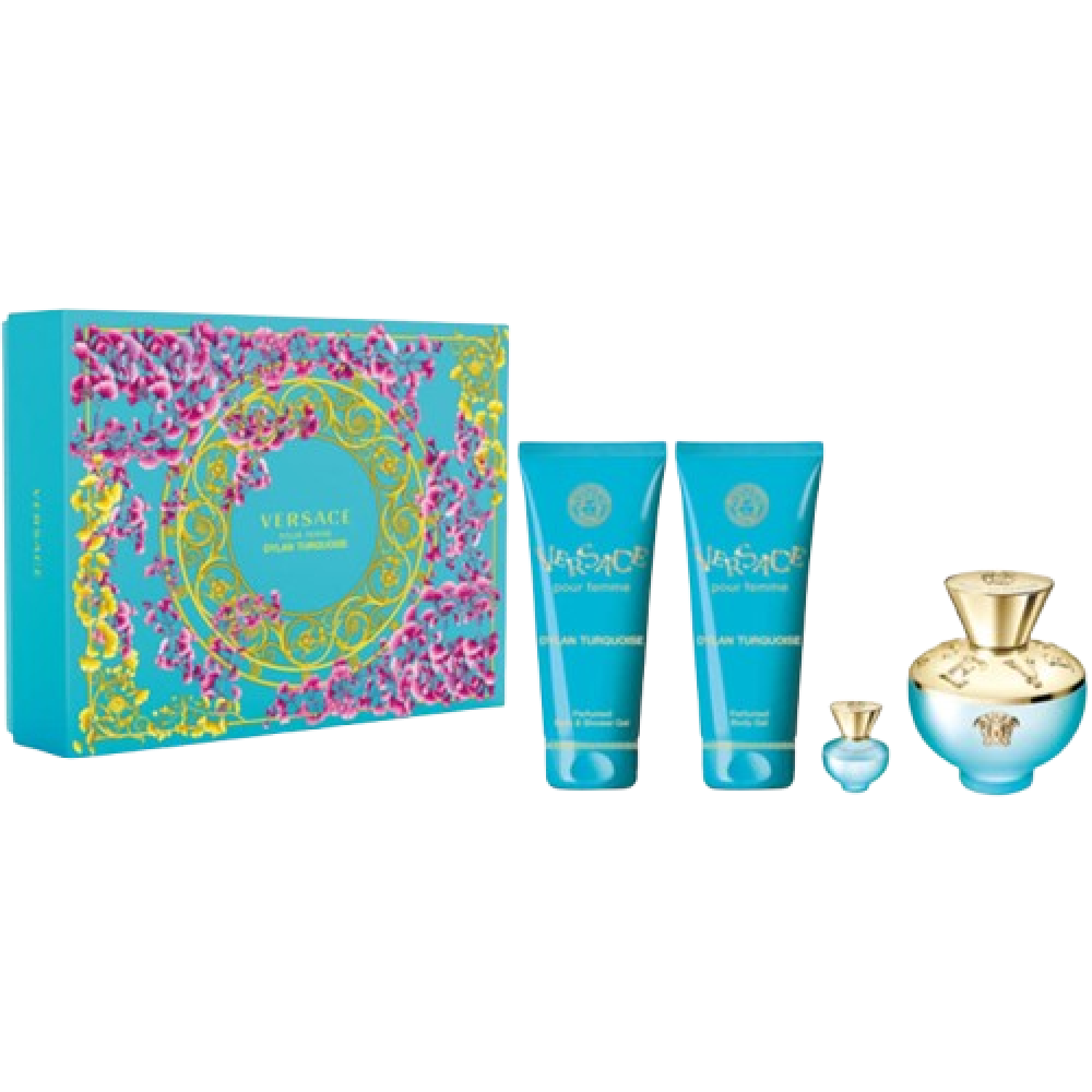 Get the Versace Dylan Turquoise set, a 100ml Eau de Parfum, a 100ml Lotion, and a 100ml Gel, along with a luxury handbag, for a long-lasting, luxurious fragrance experience. Shop now and add a touch of luxury to your daily routine.